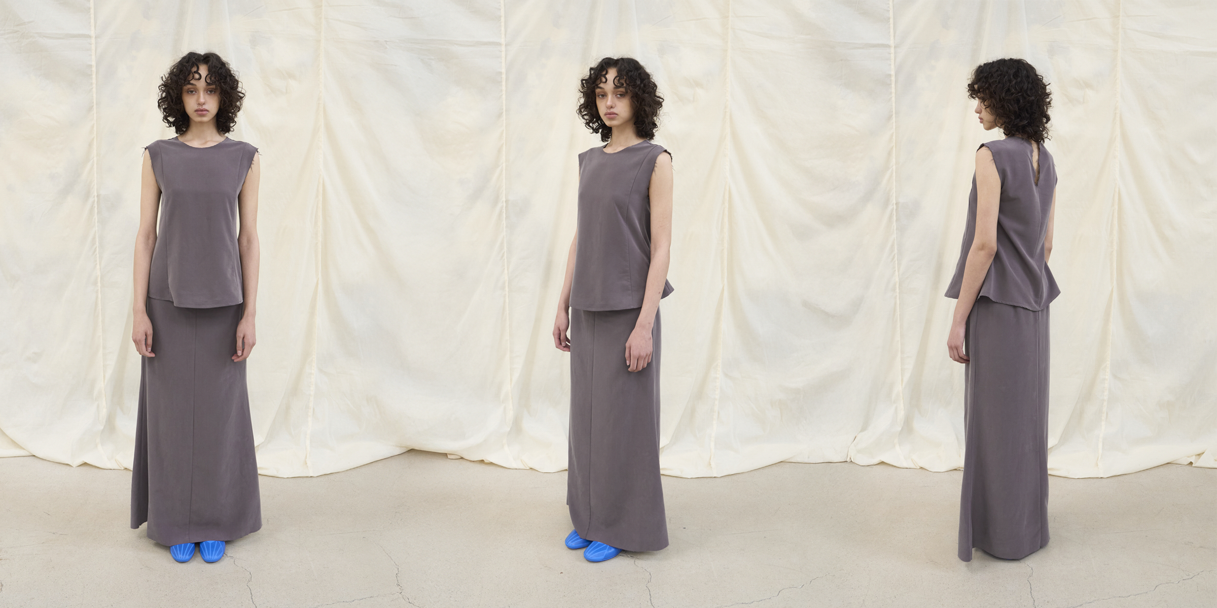 Within relaxed silhouettes, subtle awkwardness coexists with delicate details,