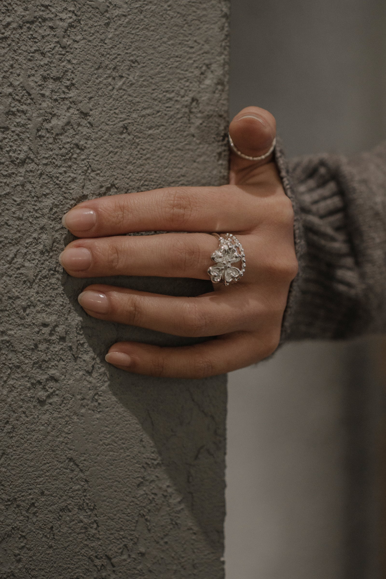 MOONLIGHT STONE dévoile une bague délicate inspirée du trèfle à quatre feuilles, symbole de chance, qui s’enroule doucement autour du doigt comme pour empêcher la fortune de s’envoler.