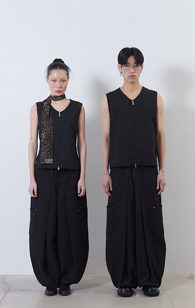 The CHE 25SS collection presents a sleek V-neck vest with a minimalist silhouette. Made from a blend of acrylic, polyester, and nylon yarns, it offers a sturdy weave and a pleasant, comfortable feel against the skin.
